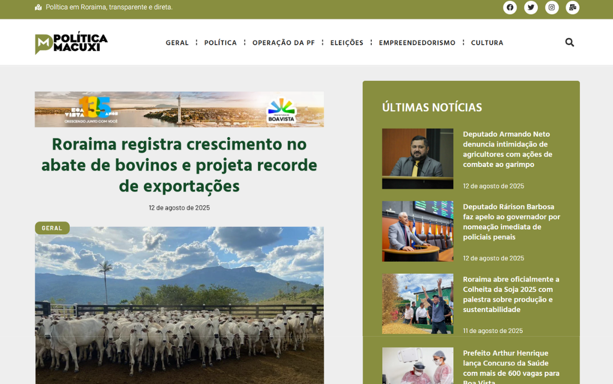 Portal de notícias desenvolvido para o Política Macuxi, veículo especializado na cobertura política de Roraima, com foco em informação transparente, direta e atualizada. O objetivo foi criar uma plataforma moderna, de fácil navegação e que valorizasse o conteúdo jornalístico.