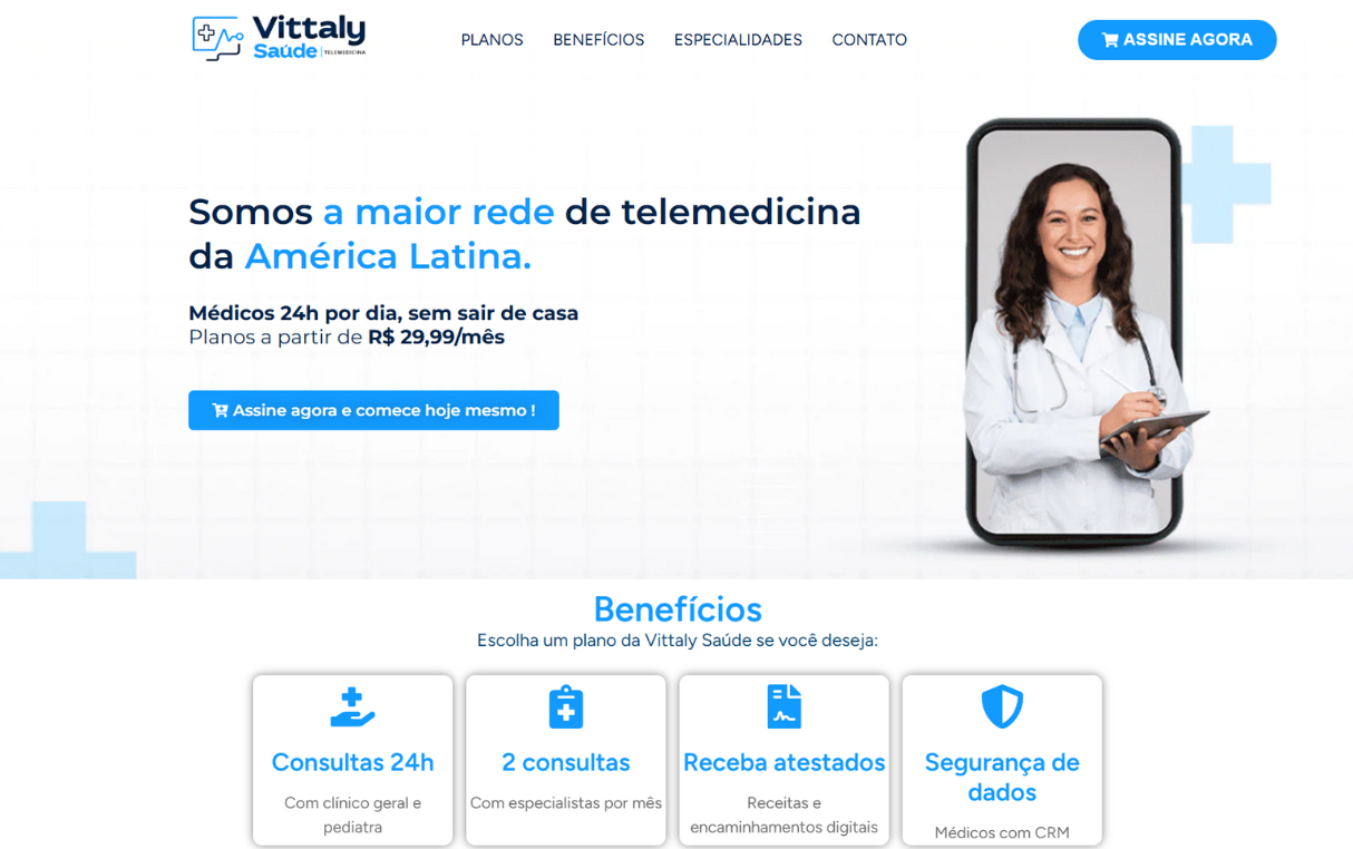 Apresentação institucional, tabela de planos e benefícios, especialidades atendidas, diferenciais como consultas 24h e emissão digital de atestados, além de botões de assinatura rápida, facilitando a conversão de visitantes em clientes.